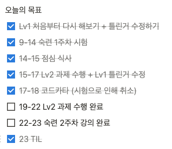- 오늘의 목표는 다 완수하지 못 했고... 내일 lv2 과제를 처리하고 2주차 강의는 토요일날 들어야겠다